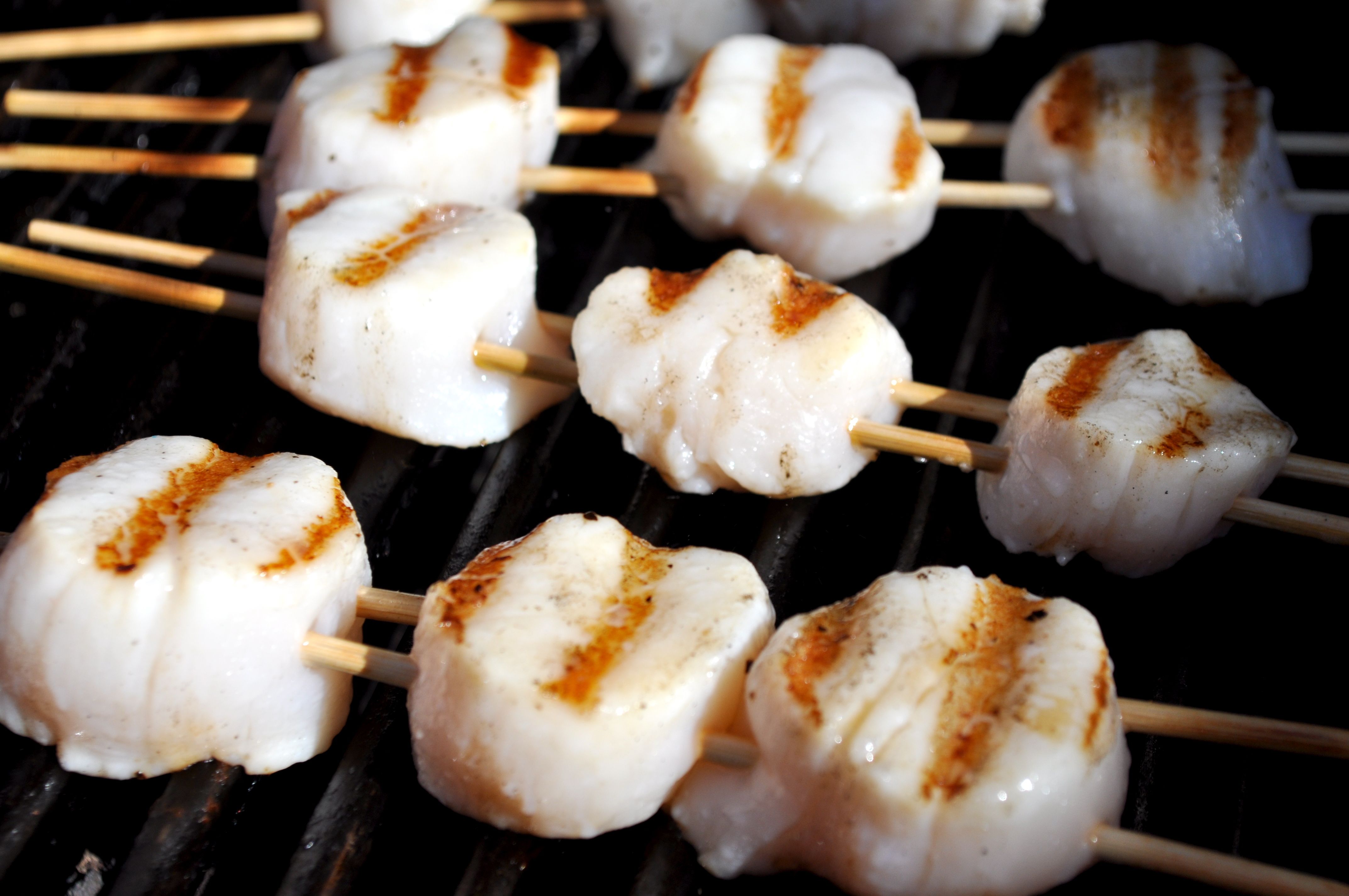 I saw these Grade A scallops at Costco for a great price and new I had to have them. The weather is warm so I thought grilling them would be great. I skewered them on 2 skewers, which made it much easer to flip them over, especially since they cook so quickly. While the grill was getting really hot, I rubbed the scallops with some canola oil (I didn’t want olive oil to overpower their delicate flavor) and kosher salt and freshly cracked pepper. I grilled them for 2 minutes on each side and they came out perfectly cooked! I paired it with a Pinot Grigio (from Costco as well) and a light salad and I was in heaven! Next time I want to make a pea puree with some fresh herbs, to go with the scallops – doesn’t that sound good?