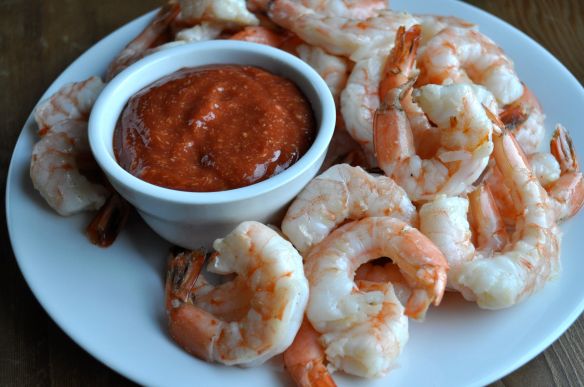 In honor of last night’s mid-season premier of The Walking Dead, I made Roasted Shrimp with “Bloody” Cocktail Sauce and it was bloody delicious! If you’re looking for a quick, easy, make-ahead recipe for Valentine’s Day tomorrow, look no further. The traditional way to cook shrimp for shrimp cocktail is to boil them in seasoned water. This recipe, from Barefoot Contessa, roasts the shrimp, which I think makes them tastier and easier to work with than a giant pot of boiling water. I used 21-25 shrimp per pound, instead of the super jumbo shrimp she suggests, and if you choose to go smaller too, just remember to reduce the cooking time to about 5 minutes. The cocktail sauce takes all of 2 minutes to put together and it’s out of this world with a great kick to it.