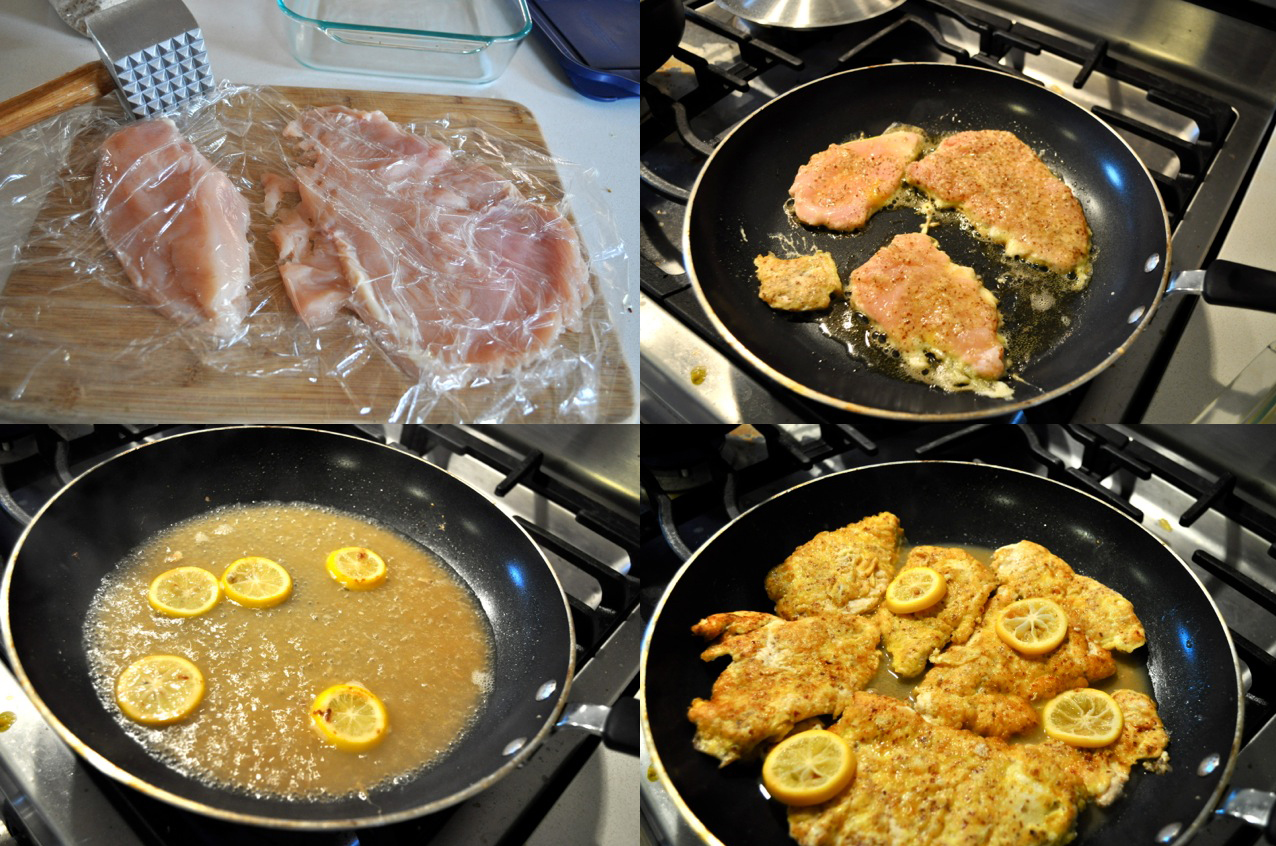 Toss the lemon slices into the pan and cook for a minute or two. Add the chicken broth (wine if you’re using it) and lemon juice, and simmer for a few minutes to reduce a bit. Add the butter to the skillet (add a bit of flour to the butter if you want a thicker sauce) and swirl it around. Reduce the heat and return the chicken to the pan to get warmed through. Sprinkle parsley on top. Enjoy.