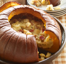 Run, don’t walk, to the market to get yourself a pumpkin or other squash to make this recipe! I’ve made it a few times for friends and everyone loves it and is surprised at how much they love it. What’s not to love with bacon, cream, and cheese? I’m making this for Thanksgiving and you might want to consider doing that too.
