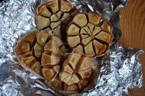 1 – Heat oven to 375 degrees. Drizzle garlic heads with oil. Wrap tightly in foil and roast until tender, about 40 minutes. Let cool, then squeeze garlic from papery skin and set aside.